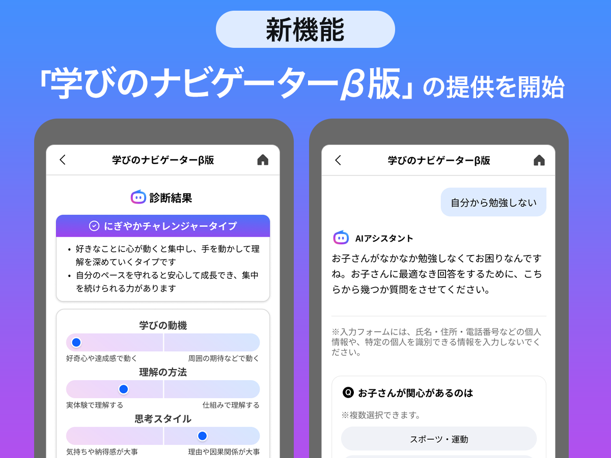「学びのナビゲーターβ版」は、小学3年生〜中学3年生の保護者が子どもの教育について、AIに安心して相談できる機能です。子どもの特性に寄り添いながら、学びの方向性や次の一歩を考えます。